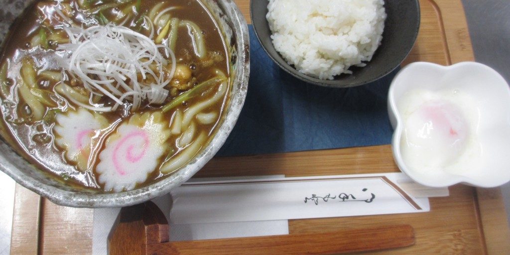 カレーうどん + トッピング温泉卵 + 半ライスの内容が最高の一品に!!
