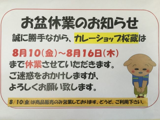 【お盆休みのご案内】 新着情報By わらしべ舎2018年8月3日日頃よりわらしべ舎西多賀工房ならびに カレーショップ桜蔵をご利用いただきまして 誠にありがとうございます。 . . 今年度のお盆休みのご案内をいたします。 下記の通りとなりますのでご確認のほど よろしくお願いいたします。…