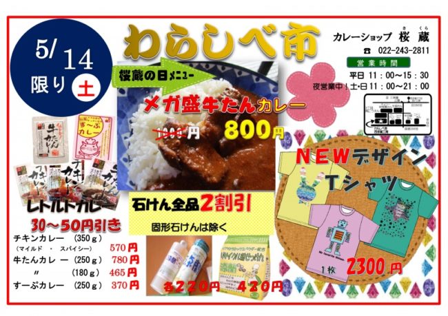 どうもHP担当です! 年3回のお買い得企画「わらしべ市」の開催が 5月14日(土)に開催をいたします! 今回の目玉は ・特盛牛タンカレー 1000円 → 800円で提供! ・春夏の新作Tシャツがデビュー! 特に毎回、売り…