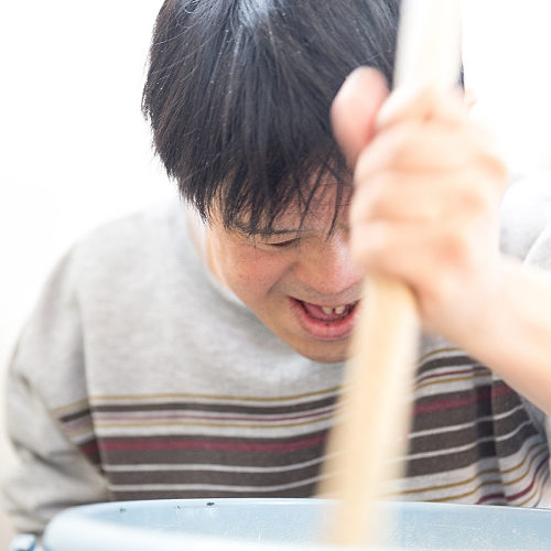 工芸チームでは、カレーショップ桜蔵で使用するランチョンマットも作っています。 米袋をランチョンマットの形に切って、一枚一枚染め上げています。 カレーショップ桜蔵でお食事の際に、トレーに上がっているランチョンマットをぜひ見て下さい。